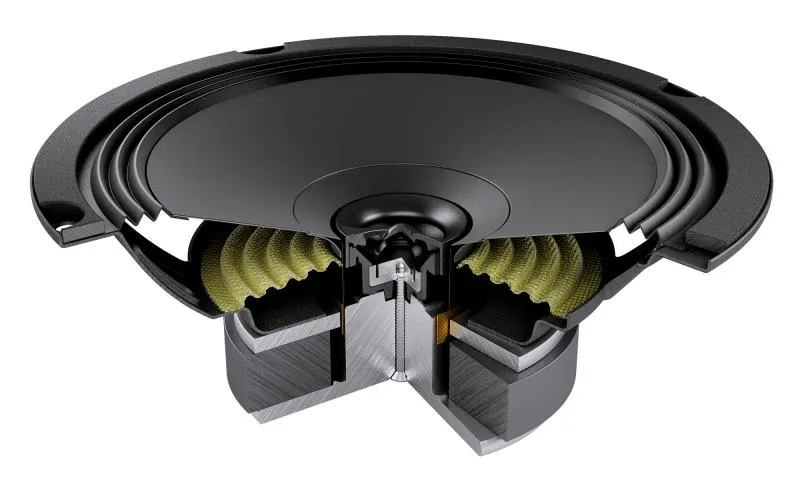 Диффузор из прессованной целлюлозы имеет экспоненциальный профиль, достоинства которого получили дальнейшее развитие с применением расчета по методу конечных элементов (Finite Element Method) и оборудования Klippel R&D Scan Vibrometer. Такой диффузор приносит единое по характеру однородное звучание во всем широком диапазоне частот, с отменными внеосевыми характеристиками. Известный прежде по старшим моделям Audison 3-волновой подвес служит эффективному снижению нежелательных резонансов, для наилучшей чистоты звучания на разных уровнях громкости. ВЧ-динамики снабжены акустической линзой-рассеивателем для улучшение внеосевых характеристик. Конструкция отличается высокой надежностью, компактная корзина снабжена специальным покрытием, защищающим от царапин, сколов и коррозии.